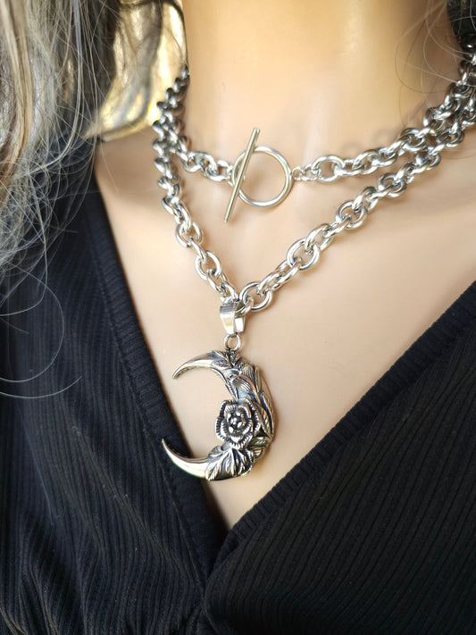 Steel Goth Moon Collar Choker Pagan Grunge Layered Toggle Necklace - Witchy Necklace