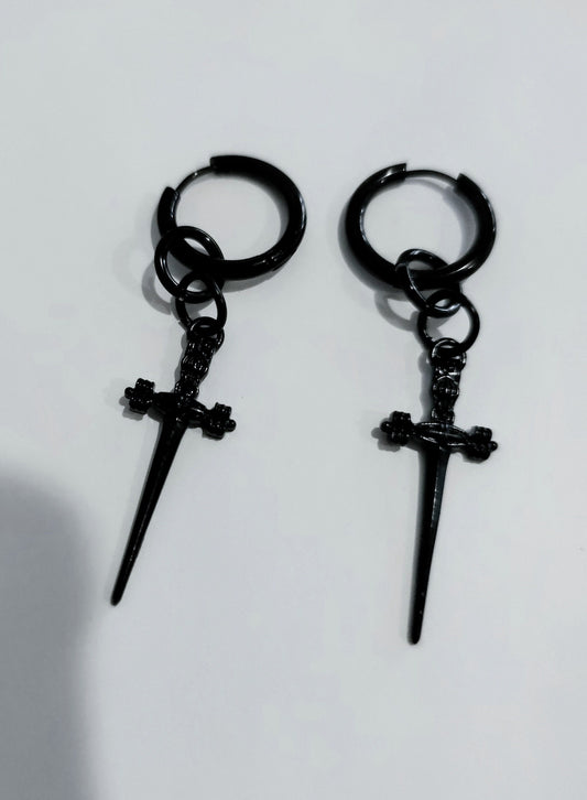 Goth Black Steel Huggie Hoop Punk Sword Dagger Dangle Earrings