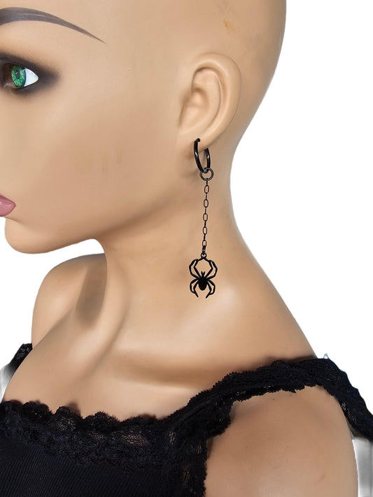 Halloween Spider Goth Black Steel Punk Hug Hoop Dangle Earrings, handmade unusual unique Occult weird Gothic grunge earrings jewelry