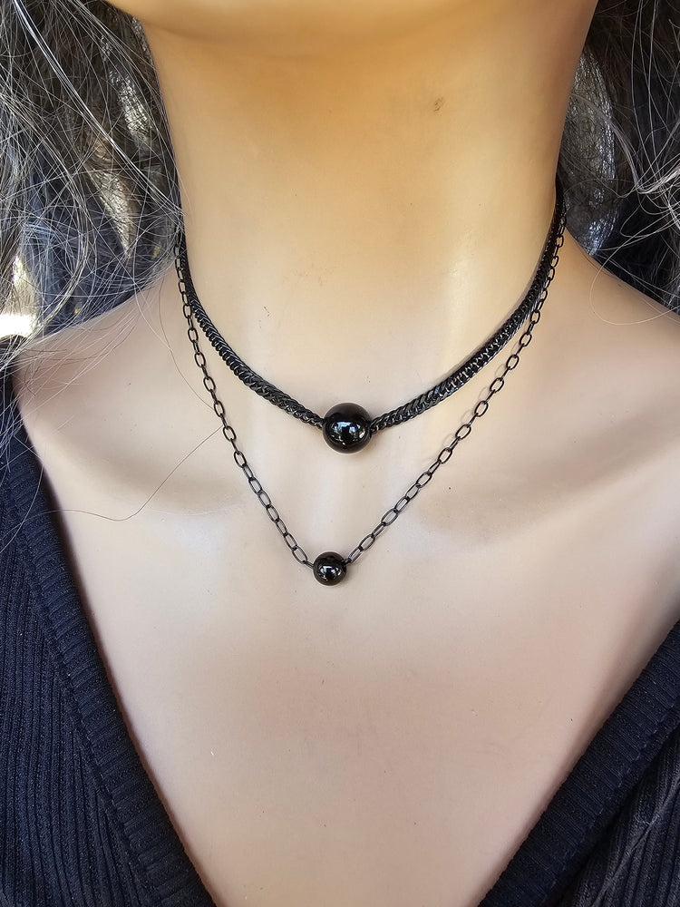Dies ist eine zierliche, minimalistische Gothic-Kugel-Halskette aus geschwärztem Stahl, die allein oder mit anderen Ketten getragen toll aussieht.
