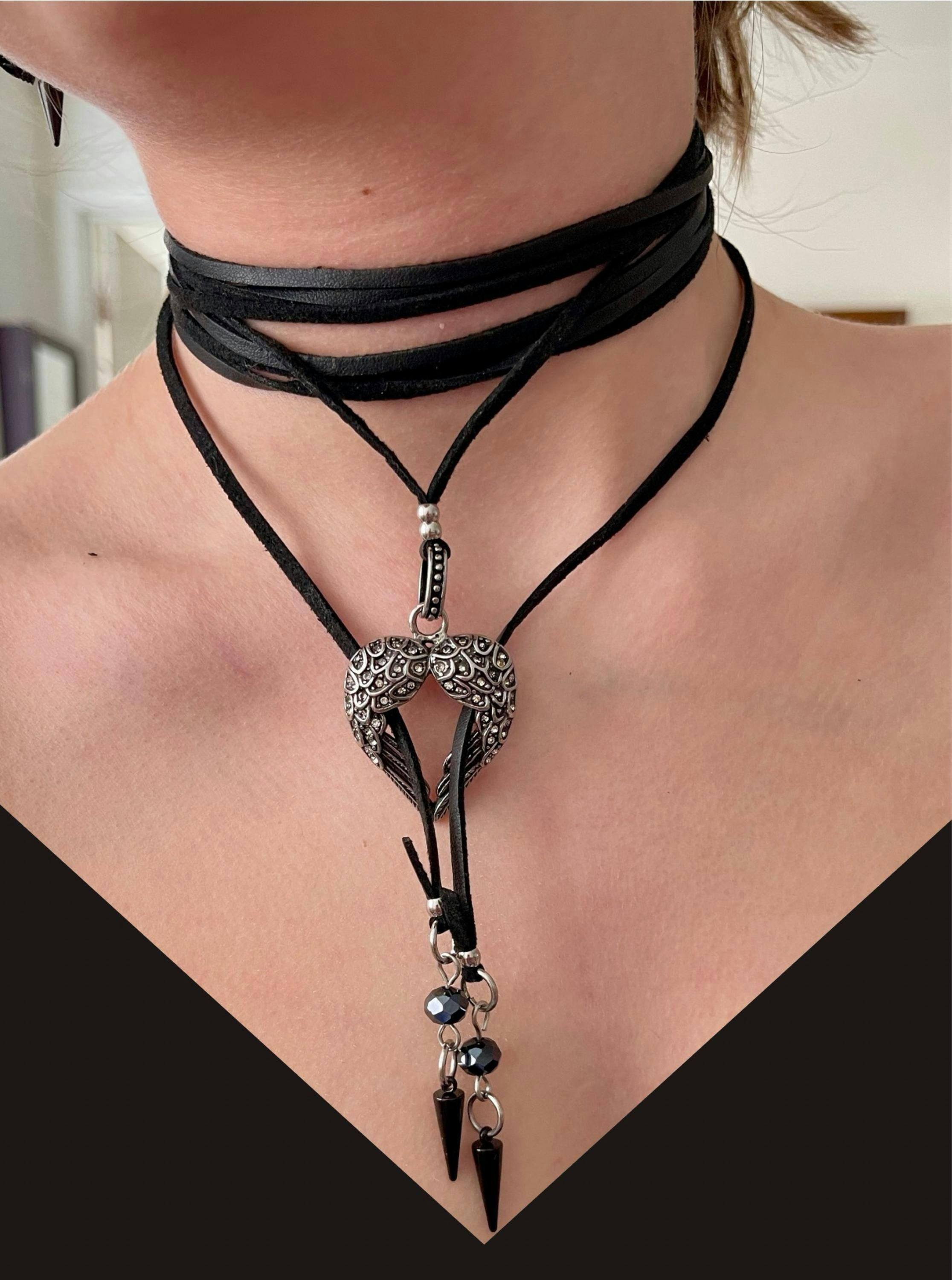 Schwarzes Leder Gothic Bolo Wrap Choker geschichtet Lariat Halskette mit Spikes und Herz-Anhänger