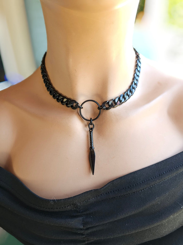 Dies ist ein kühner und kantiger geschwärzter Stahl Gothic Punk Grunge Stil Halskette mit Speer Anhänger. Ungefähr 14" bis 17" in verstellbarer Länge mit eingebautem Extender.
