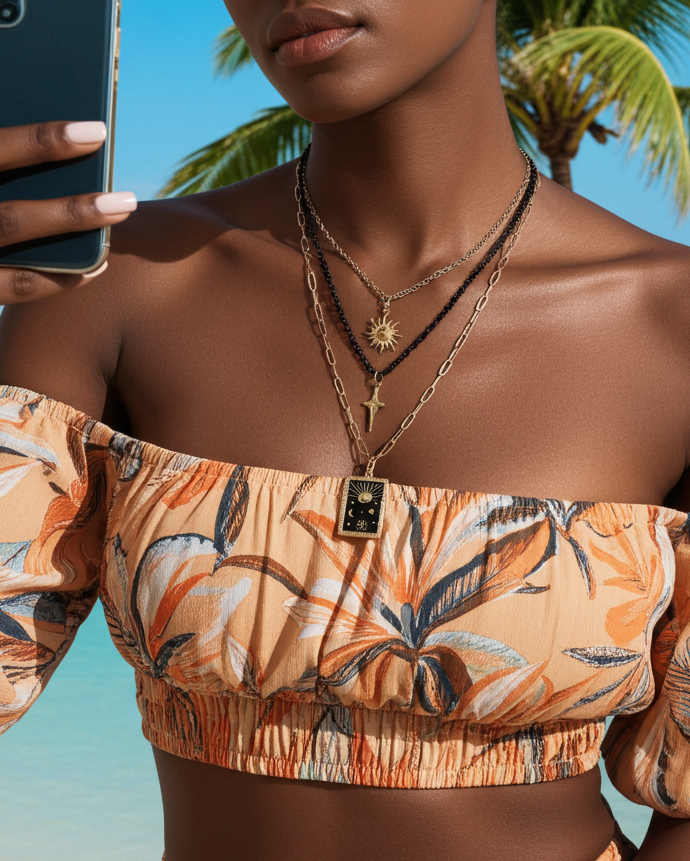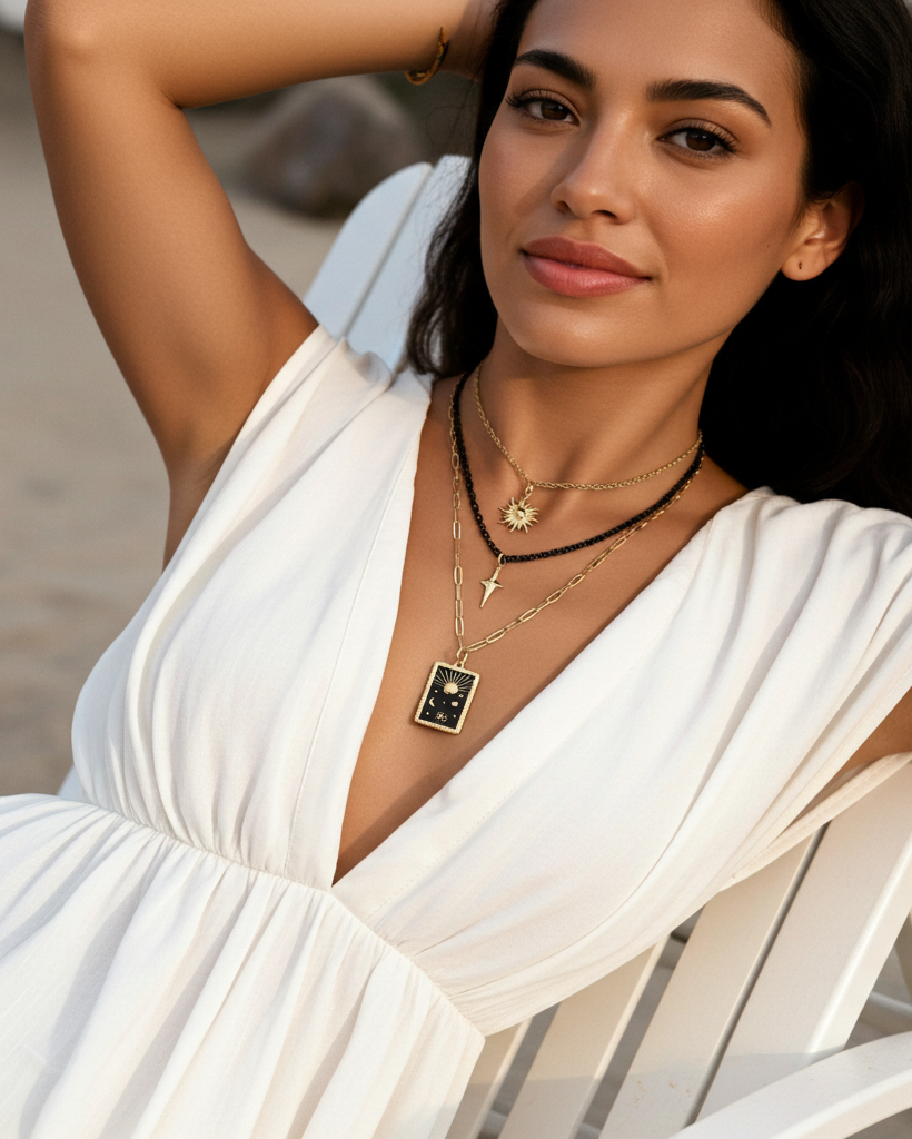 - Design: Einheitliche dreilagige Halskette mit Sonnenanhänger, Sternanhänger und himmlischem Rechteck-Amulett