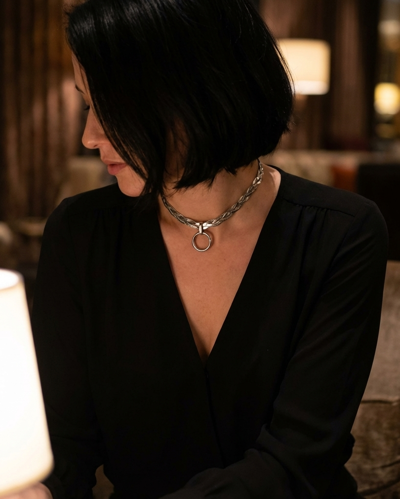 This is a quality O-Ring Submissive Day Collar Choker Necklace on a beautiful Stainless Steel braided herringbone chain – a symbol of elegance, strength, and submission. You can choose a regular clasp with extender, our Shield Maiden™ Signature Lock & Key Clasp, or a permanent closing ring in silver for a more intimate message.