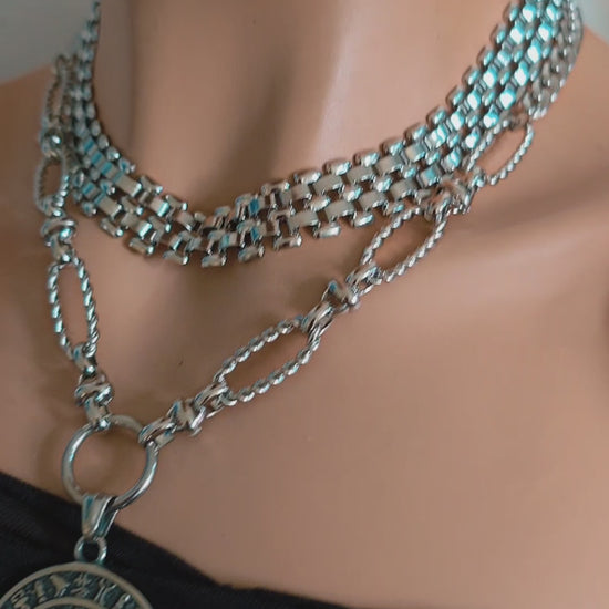 Das obere Collier ist aus hohlem Edelstahl gefertigt, wodurch es überraschend leicht und dennoch auffallend ist. Es ist von 15 bis 17 Zoll verstellbar, um eine perfekte Passform zu gewährleisten. Die untere Kette besteht aus verdrehten Stahlgliedern und einem großen zentralen Ring, der ein detailliertes Auge des Horus-Medaillon zeigt, das von Hieroglyphengravuren umgeben ist. Sie lässt sich von 16 bis 19 Zoll verstellen und liegt bequem auf dem Schlüsselbein auf.