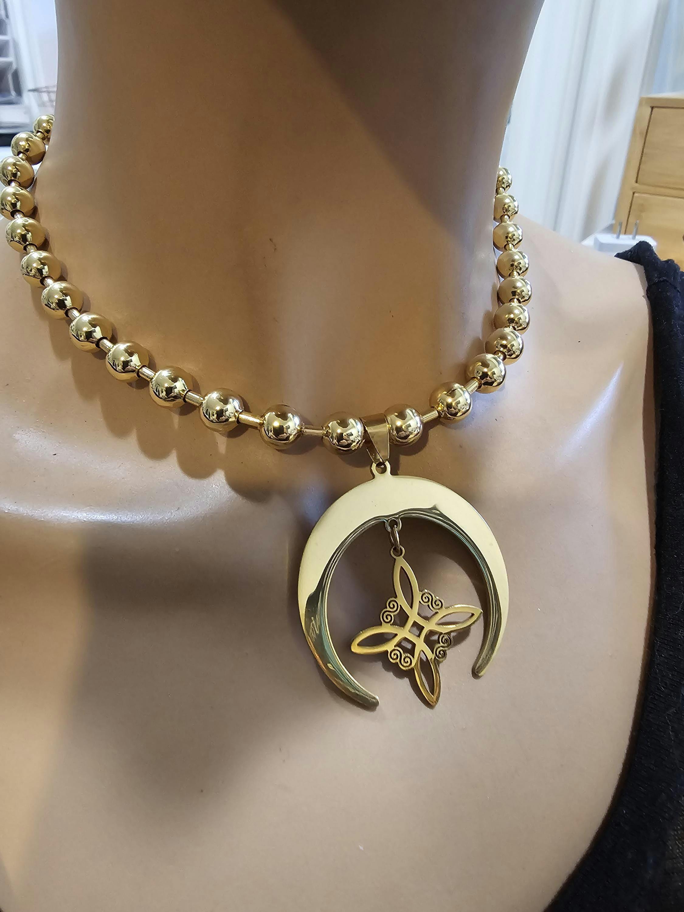 Dies ist eine goldgefüllte Stahlkugelkette mit wunderschönem Doppelhorn-Mondsichel-Anhänger und Hexenknoten. Macht eine große hexenhafte ästhetische Aussage.