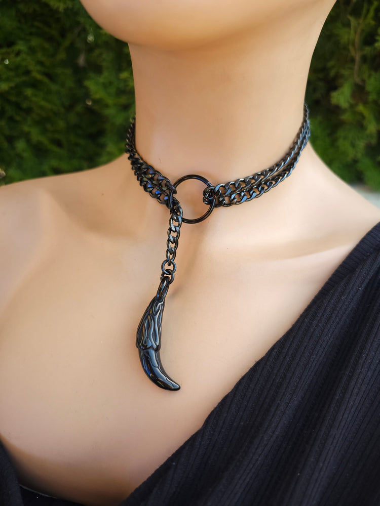 Slip Chain Schwarz Stahl Gothic Punk Kragen Choker Lariat Wrap Halskette mit Stahl Tusk Anhänger