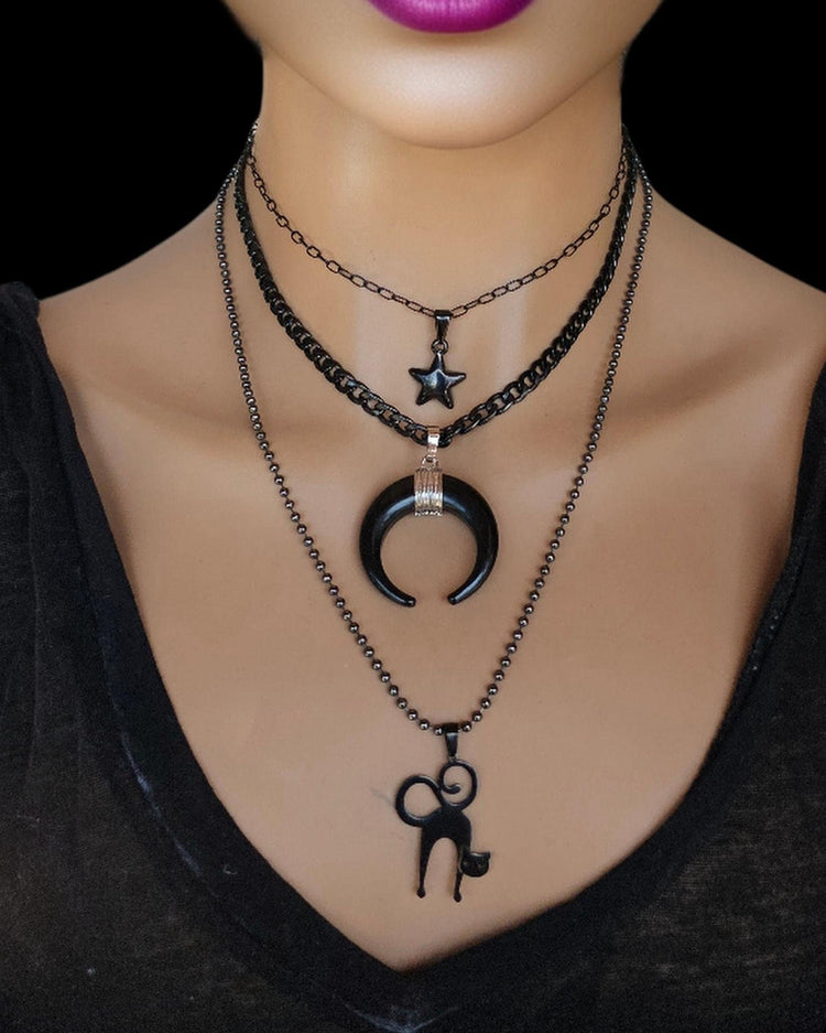 Acero Negro Gato Cuerno Luna Estrella Pagano Bruja Goth Punk Collar en capas Set