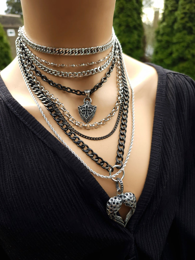 Este conjunto de collar en capas de cadena gruesa de acero inoxidable hecho a mano es una impresionante pieza de joyería perfecta para los amantes de los accesorios atrevidos y atrevidas. Se trata de un collar de 8 vueltas con un extensor incorporado que permite llevarlo a diferentes longitudes. Añadiendo profundidad y dimensión a la pieza es un acero y micro pave corazón alado colgantes y encanto escudo. Una estética muy punk y grunge.