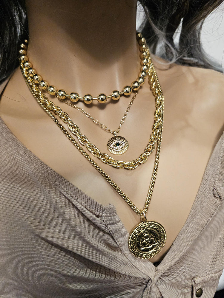 Este conjunto de collar de estilo maximalista, hecho a mano y chapado en oro de 24 quilates, consta de cuatro collares separados que se pueden llevar juntos o solos.