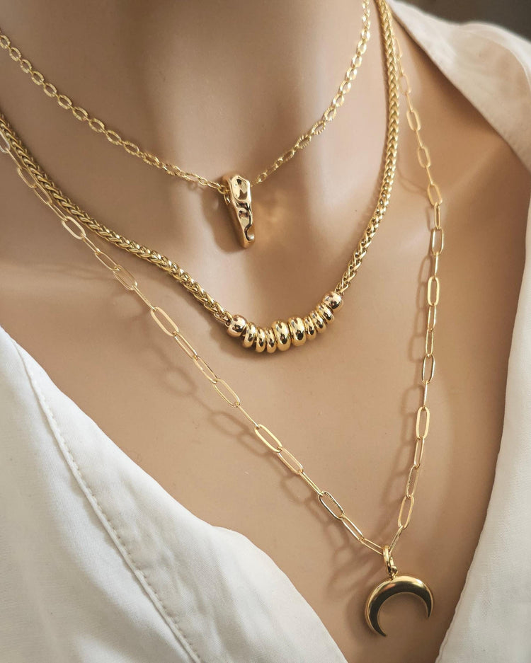 ⚔️ Stacked pendant necklaces set with crescent horn moon and gold nugget pendants.