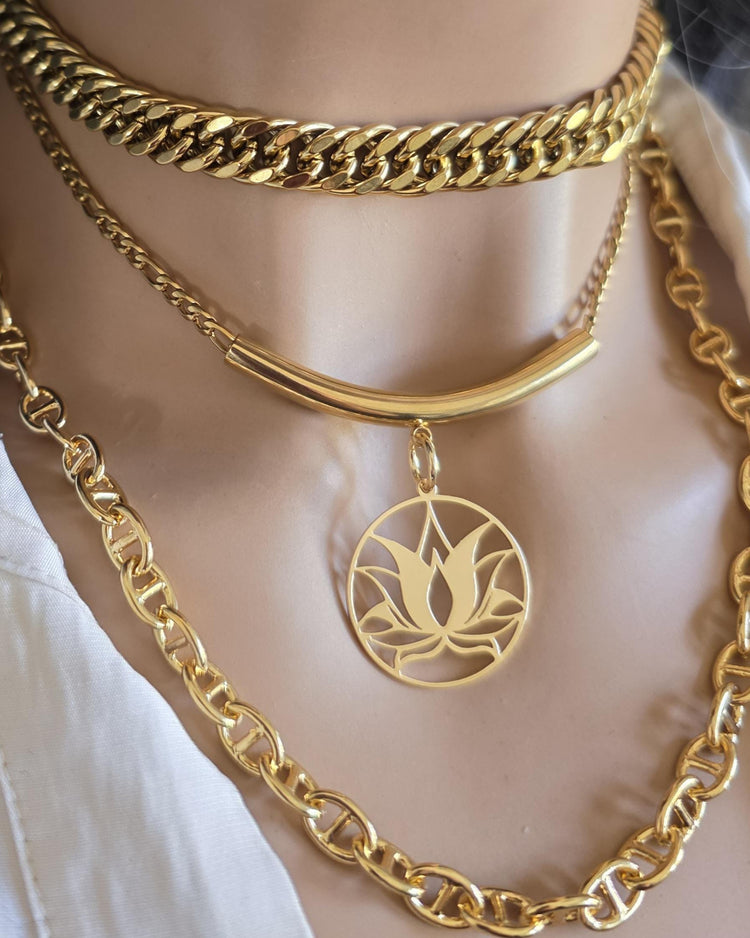 Juego de collar con colgante de loto de cadena gruesa de varias vueltas en capas de oro