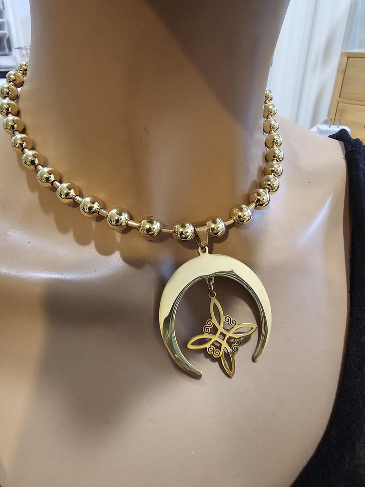 Collar gargantilla con cadena de bolas de acero dorado con un precioso colgante de luna creciente de doble cuerno y nudo de bruja. Hace una gran declaración estética de bruja.