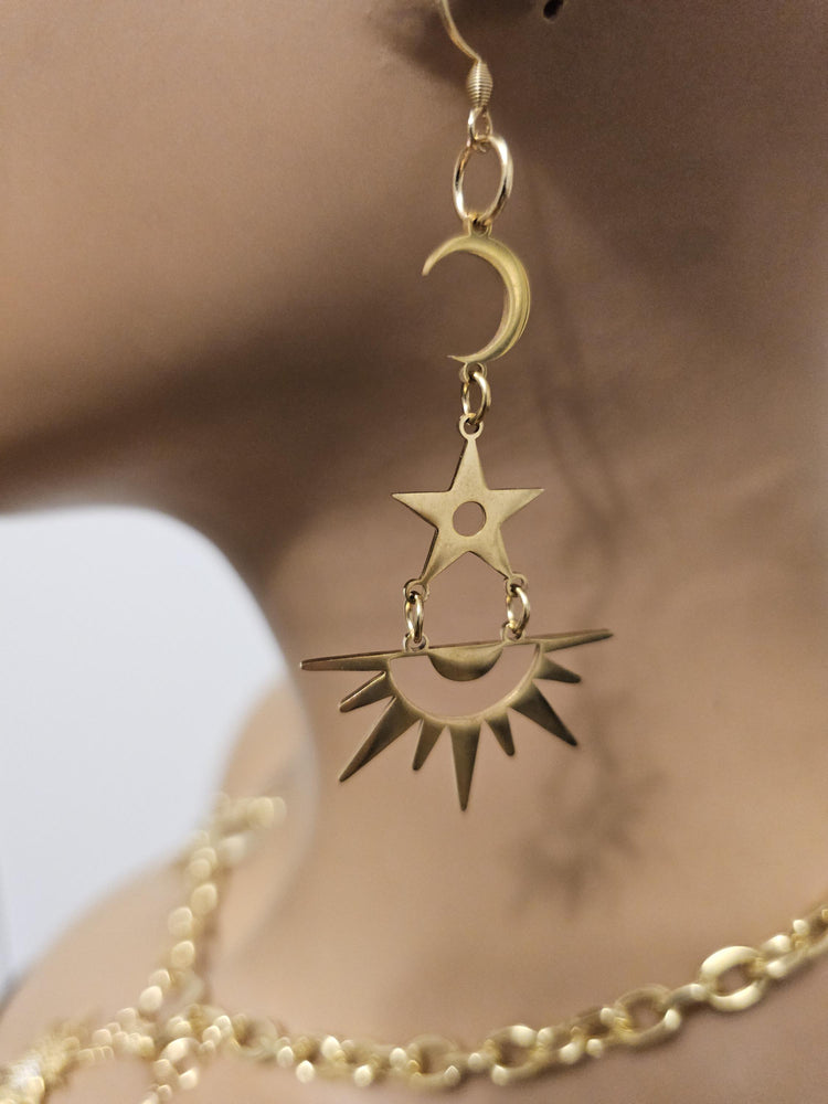 Hecho a mano de acero chapado en oro de 24 quilates de oro Sol Estrella Media Luna Earthy Pagano Pendientes colgantes. hace un gran regalo de joyería celestial hecho a mano para los paganos y las brujas.