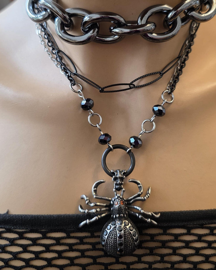 Este es un audaz y nervioso, pero también glam todo el acero Goth Punk estética araña colgante collar apilado multi hebra conjunto.