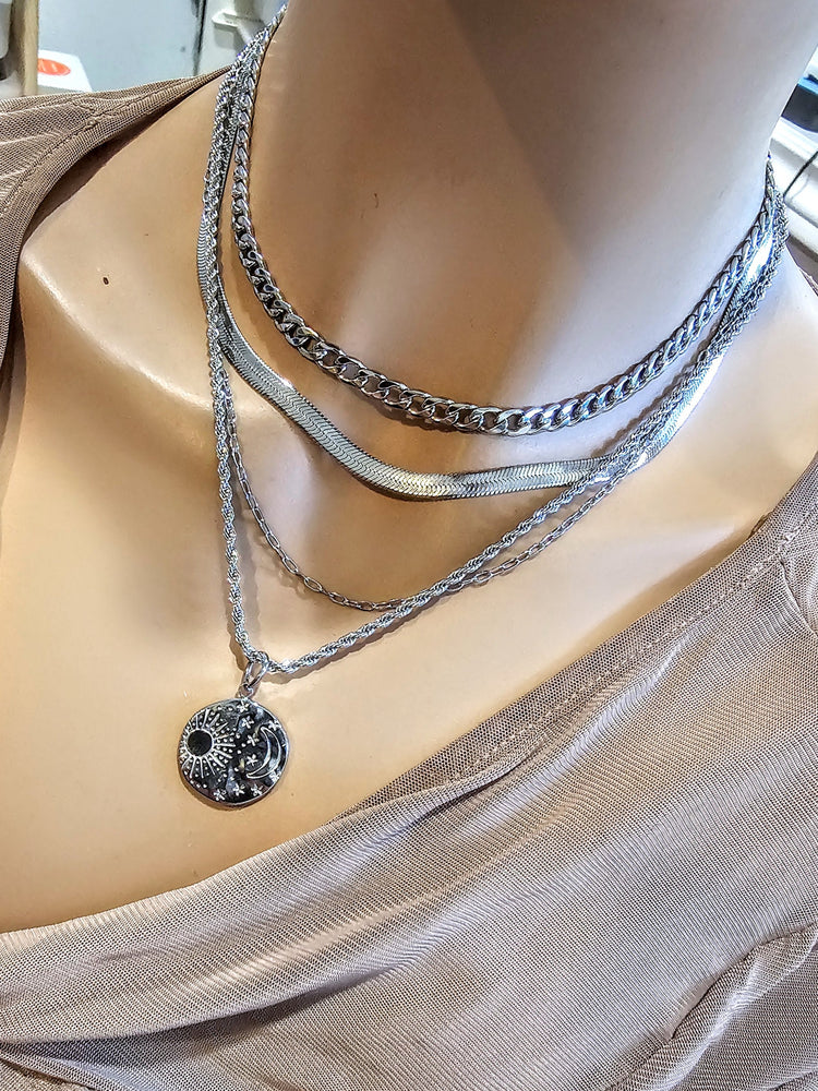 Este collar apilado es un collar de acero inoxidable de varias vueltas, todo en uno, con un bonito colgante de medallón de sol y luna.