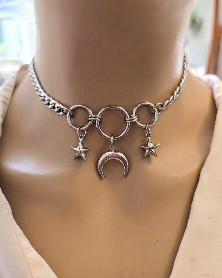 Este es un elegante y lujoso collar gargantilla de estilo sumiso con anilla en forma de O en cadena 100% de acero inoxidable, anillas y colgantes de luna y estrella. Puede elegir un cierre de langosta con extensor, un cierre hexagonal de bloqueo con llave, o un anillo de aleación permanente de bloqueo que requiere un simple juego de alicates para cerrar de forma permanente para un mensaje más íntimo.