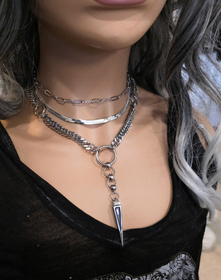 This necklace features 3 strands of chain styles and an oversized spike or Coffin nail pendant.
