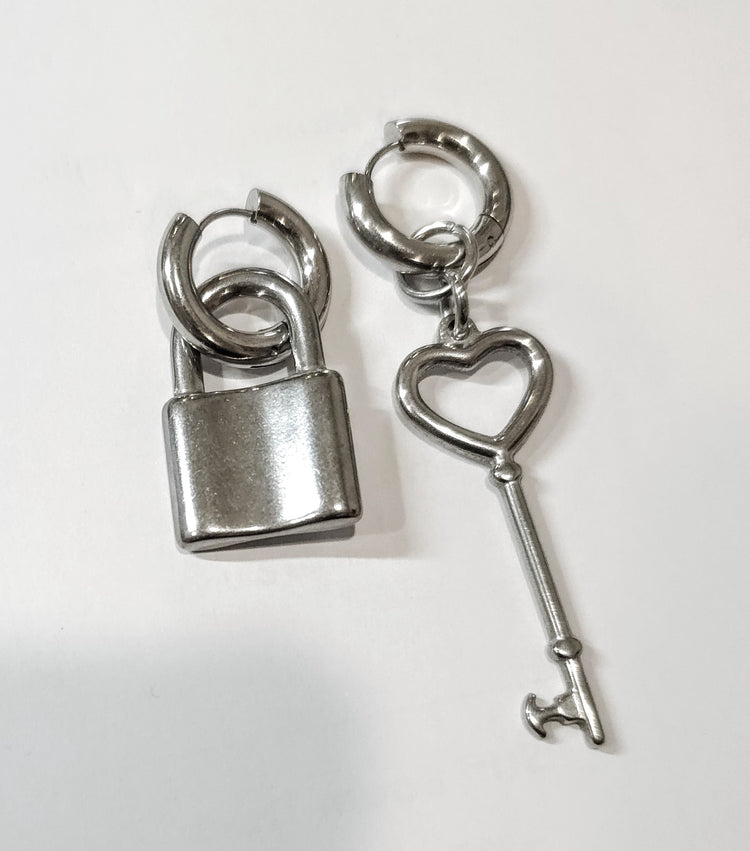 Pendientes de acero Huggie Hoop Dangle Par Lock & Key, hecho a mano Goth bondage BDSM joyería