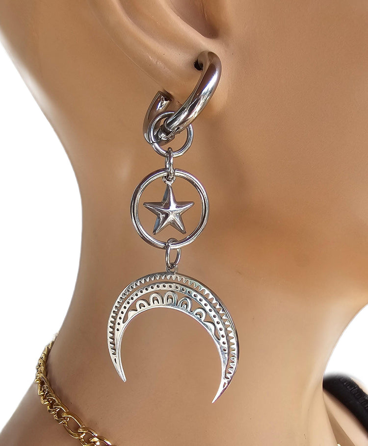 Luna de acero de media luna estrellas cuelgan Huggie Hoop Pendientes PAR - Pagan Witchy