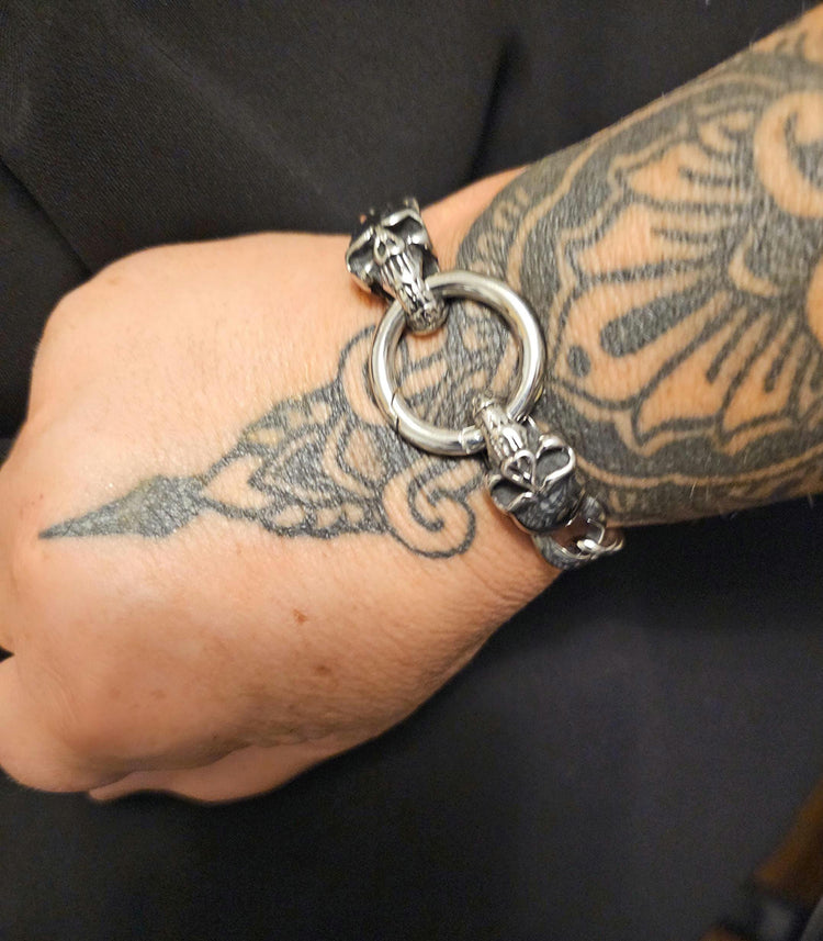 Libérez votre style audacieux avec ce bracelet en acier inoxydable d'inspiration industrielle. Parfait pour les amateurs de mode punk, gothique, alternative ou biker, ce bracelet est doté d'un fermoir unique en forme de tête de mort. Fabriqué en acier inoxydable durable, il est conçu pour résister au ternissement et conserver son éclat pendant des années.