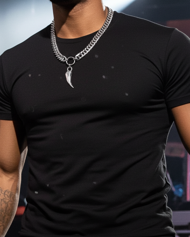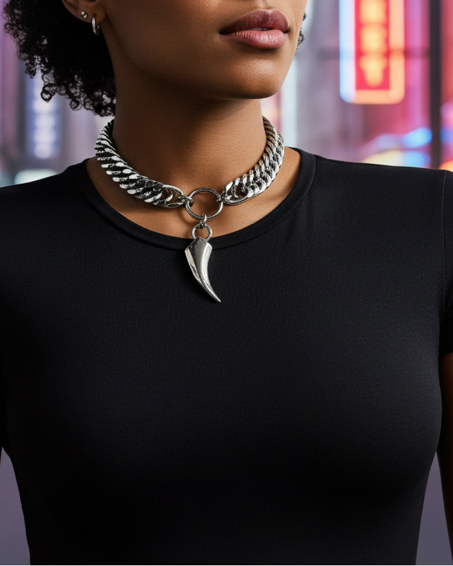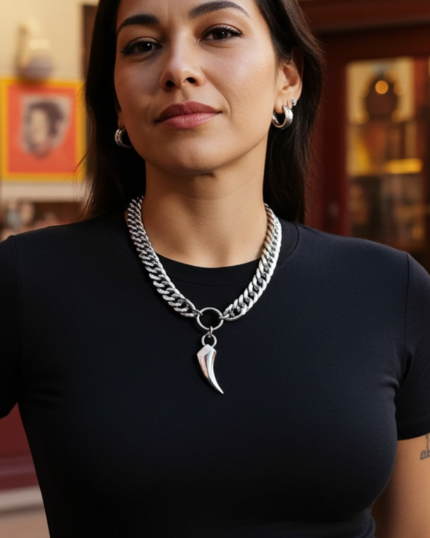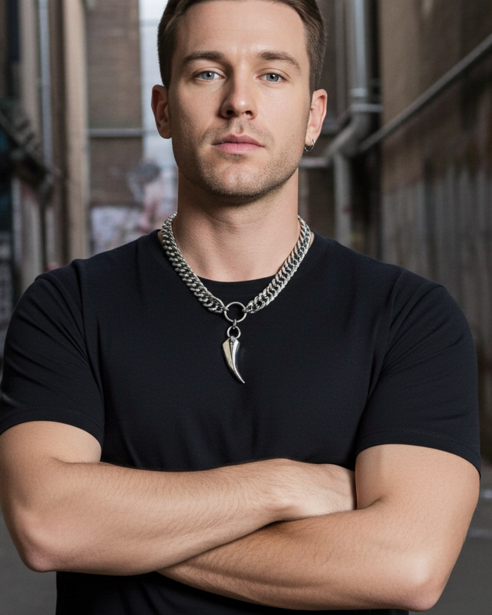 Thick curb chain and polished fang pendant.