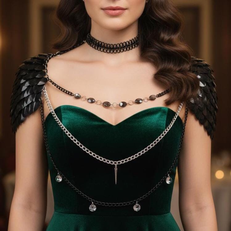 This sculptural shoulder mantle features layered black scales paired with draped chainwork that cascades across the back and shoulders, creating fluid motion with every step. Inspired by ceremonial armor and modern festival couture, the piece frames the body while remaining strikingly lightweight and comfortable.