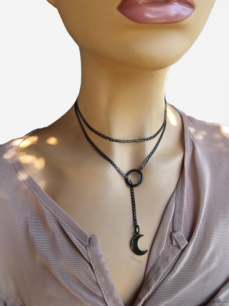 Black Steel Moon Pagan Goth Lariat Slip Chain Choker Wrap Necklace
