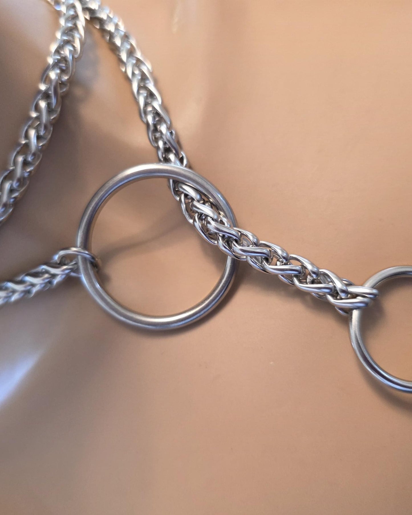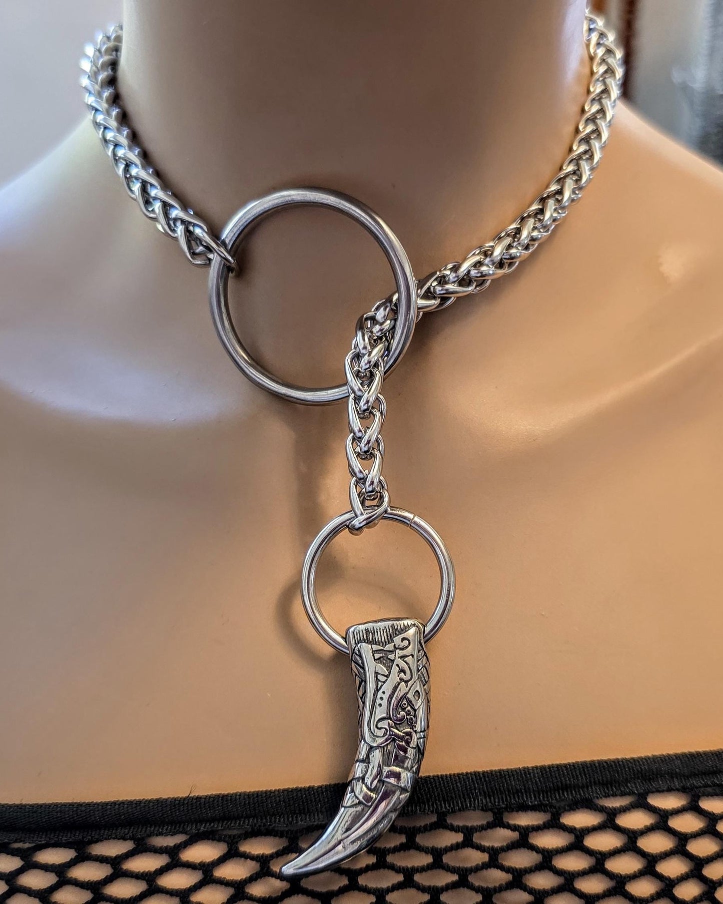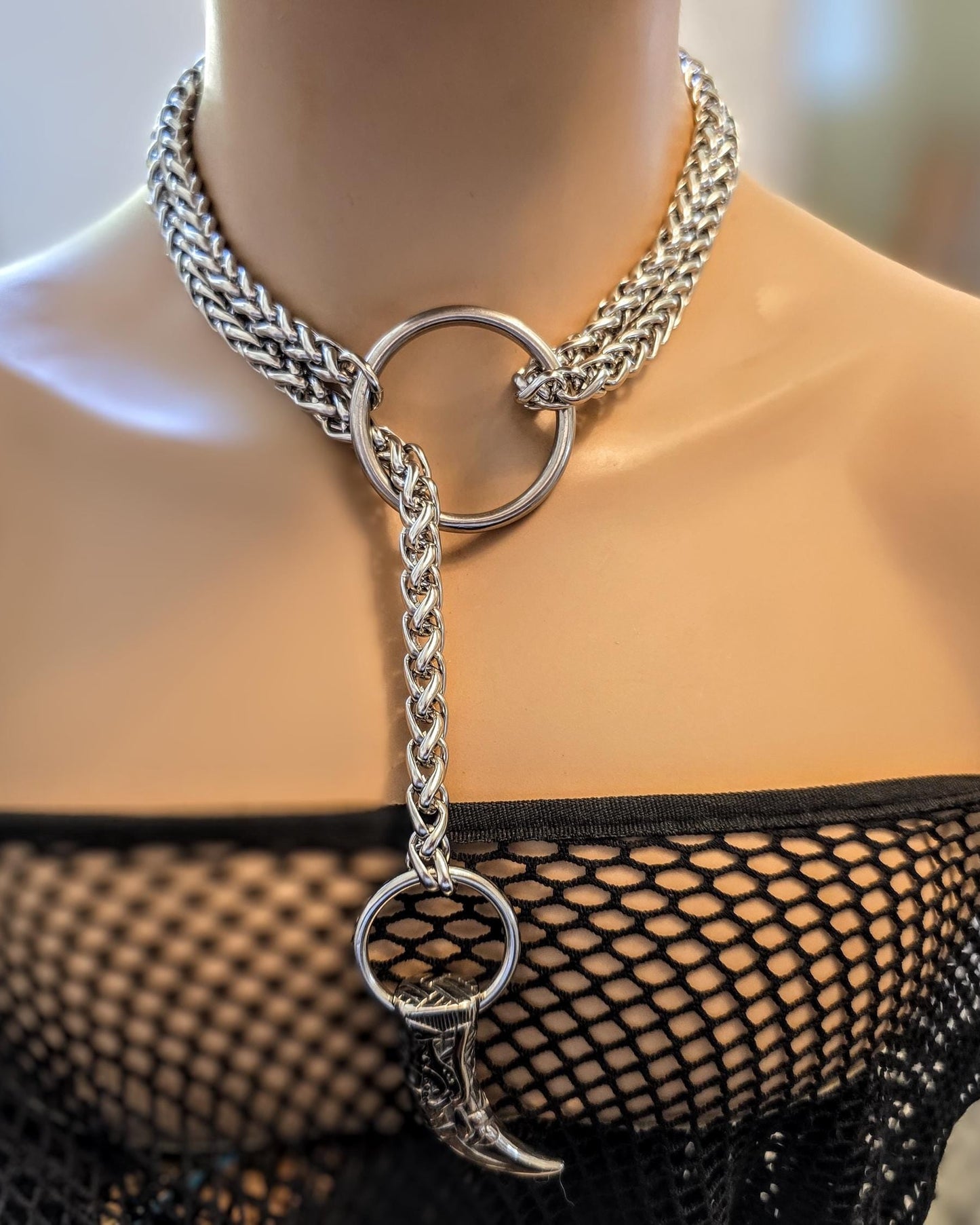 This is a very hefty slip chain leash style collar choker necklace. It is 100% stainless steel. It can be worn as elegant looking collar. The long wheat chain leash has a carved stainless steel tusk pendant end that passes through a large stainless steel O Ring. Let it fall open and free for a playful effect or wrap it around the neck twice for an appealing everyday casual look. An elegant effect that has a touch of the forbidden, the effect is , intriguing, refined and playful.