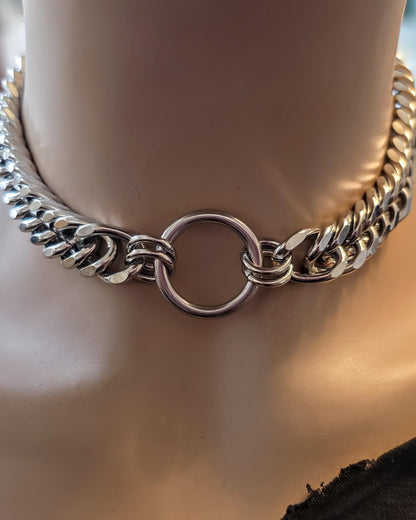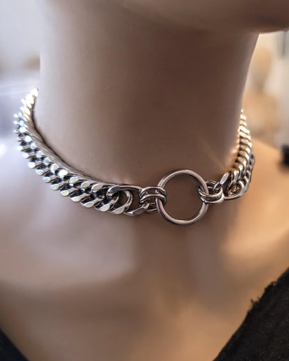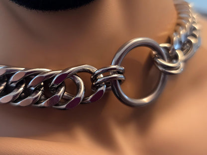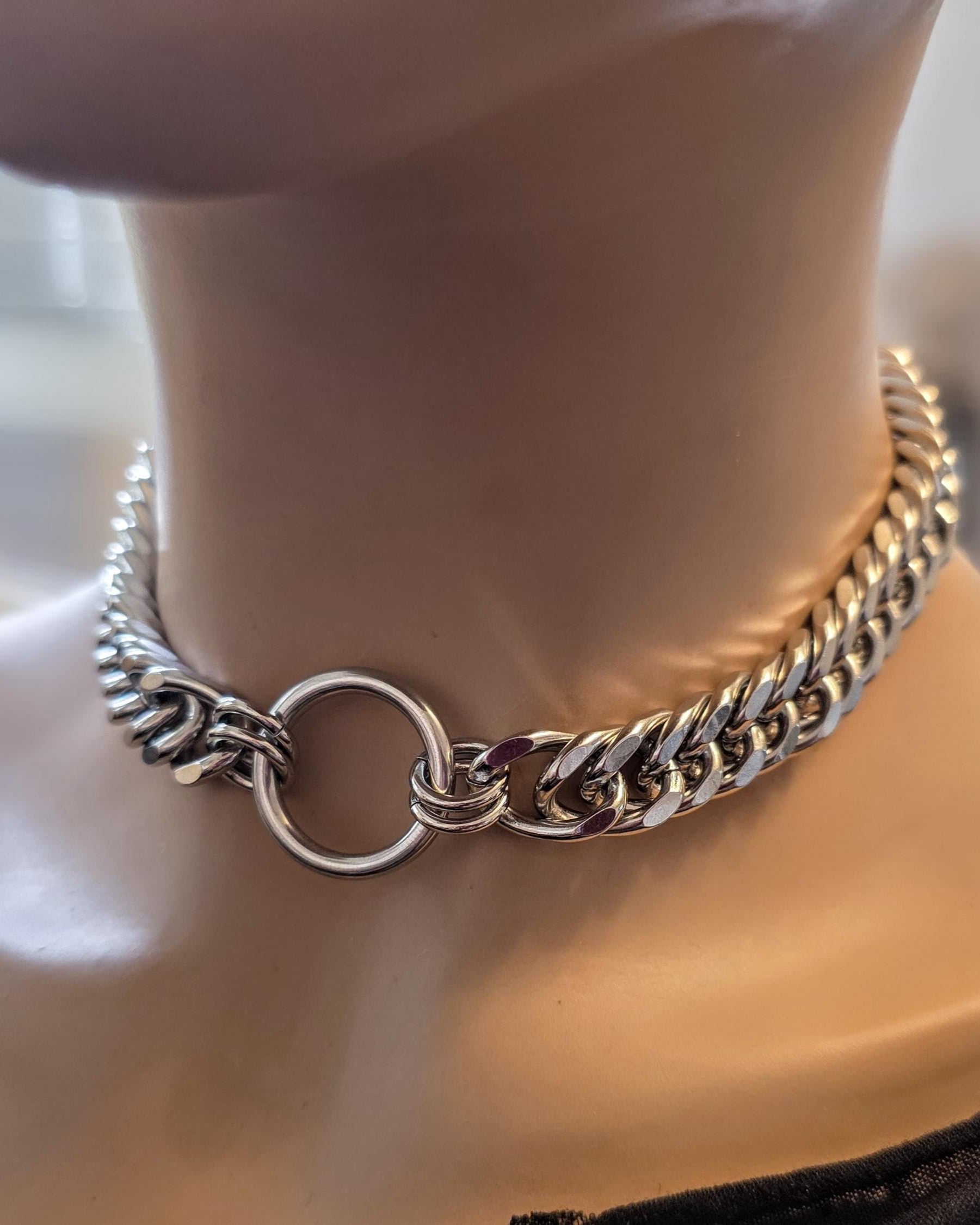 This is a super chunky masc style top quality O-Ring Submissive Day Collar Choker BDSM aesthetic Necklace on a Stainless Steel diamond cut chain. A luxury feeling symbol of elegance, strength, and submission.