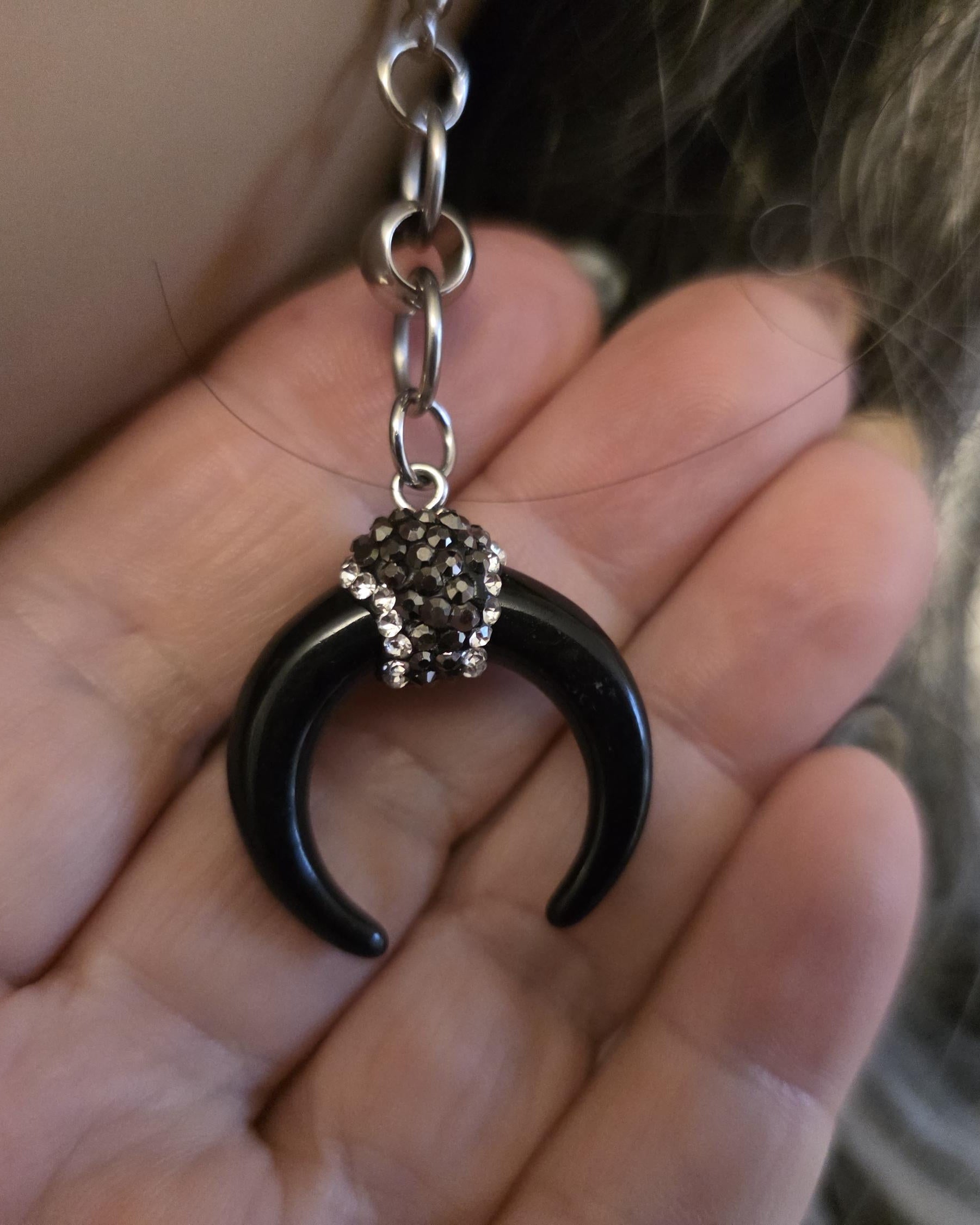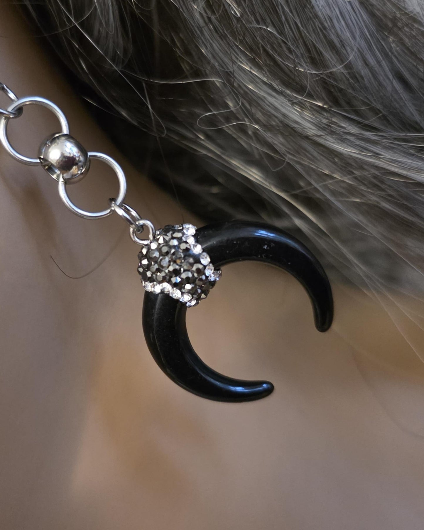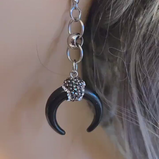 Handmade gothic acrylic double horn crescent moon Earrings on Steel Huggie Hoops, this pair of earrings are completely hypoallergenic and non tarnish.