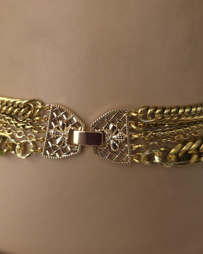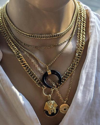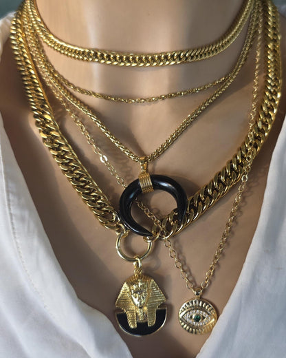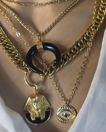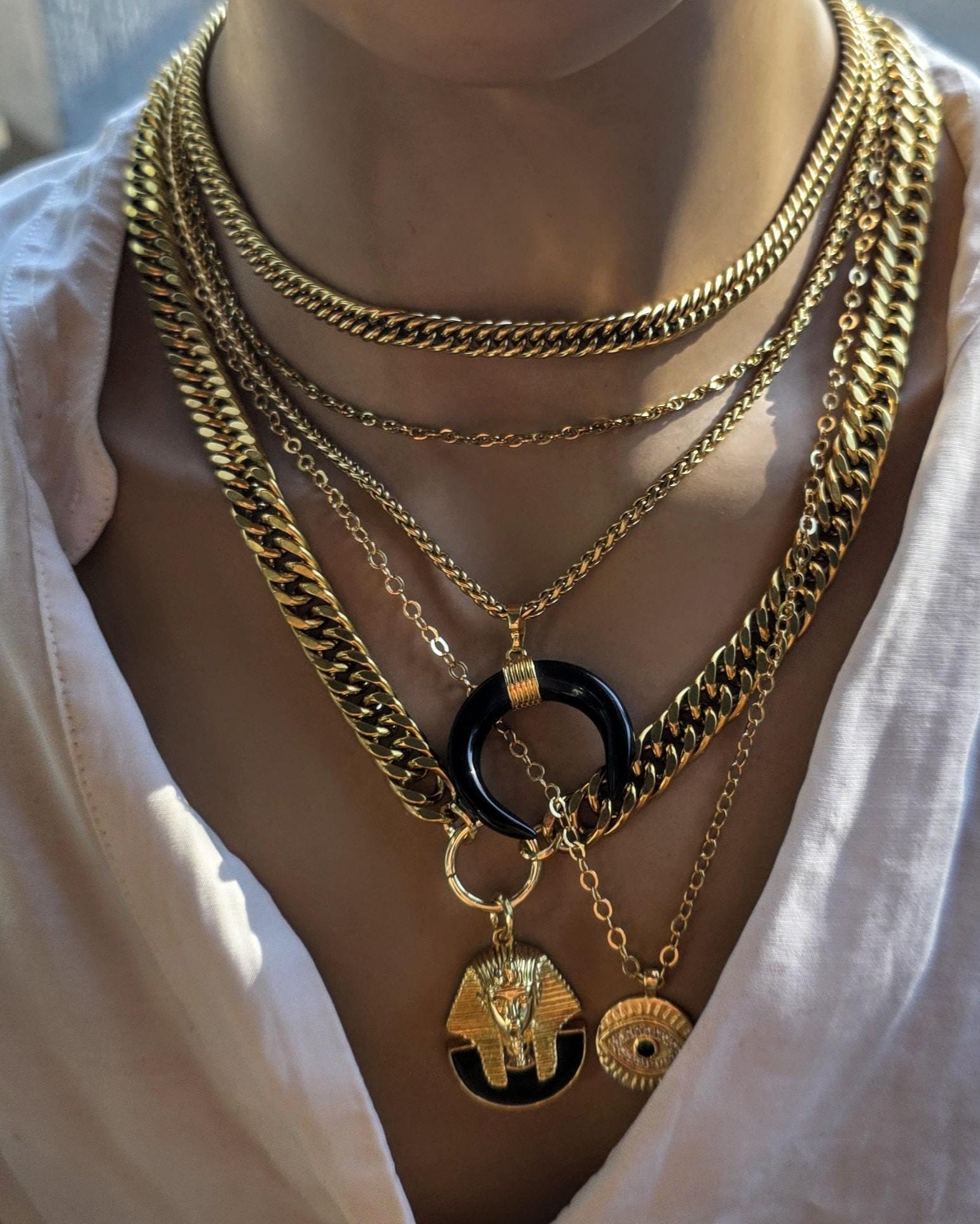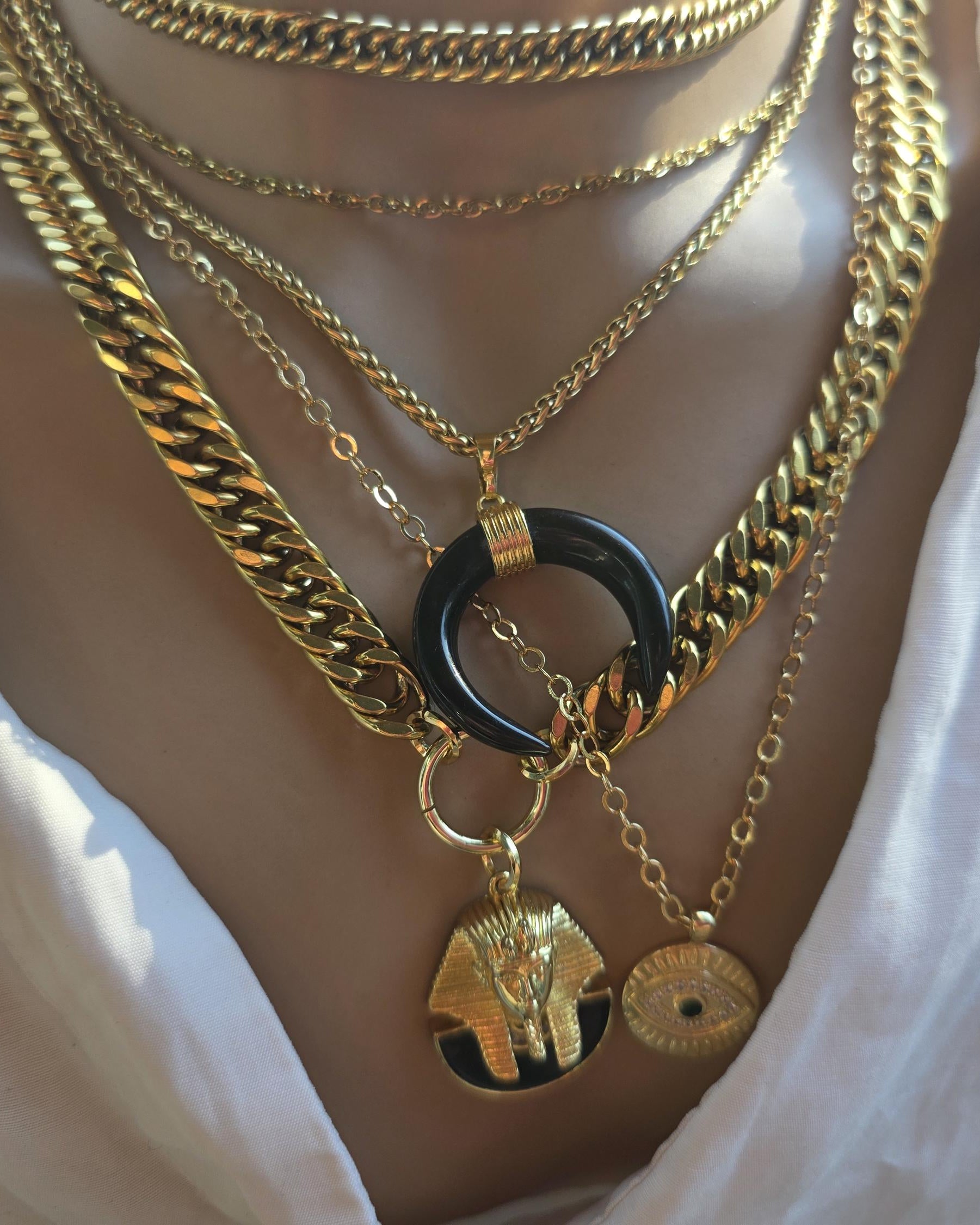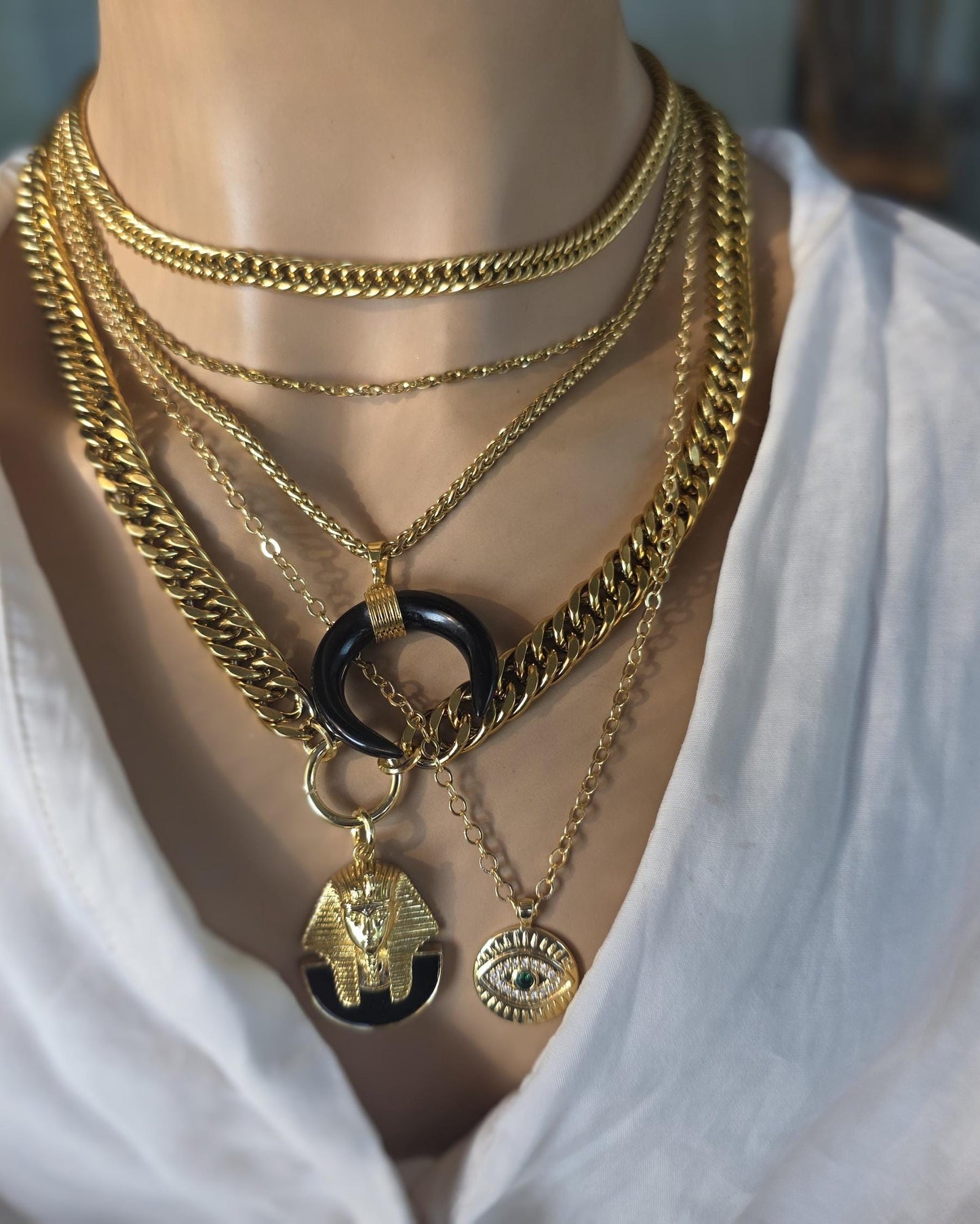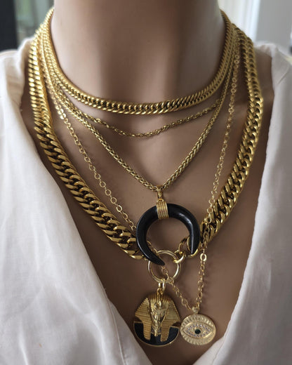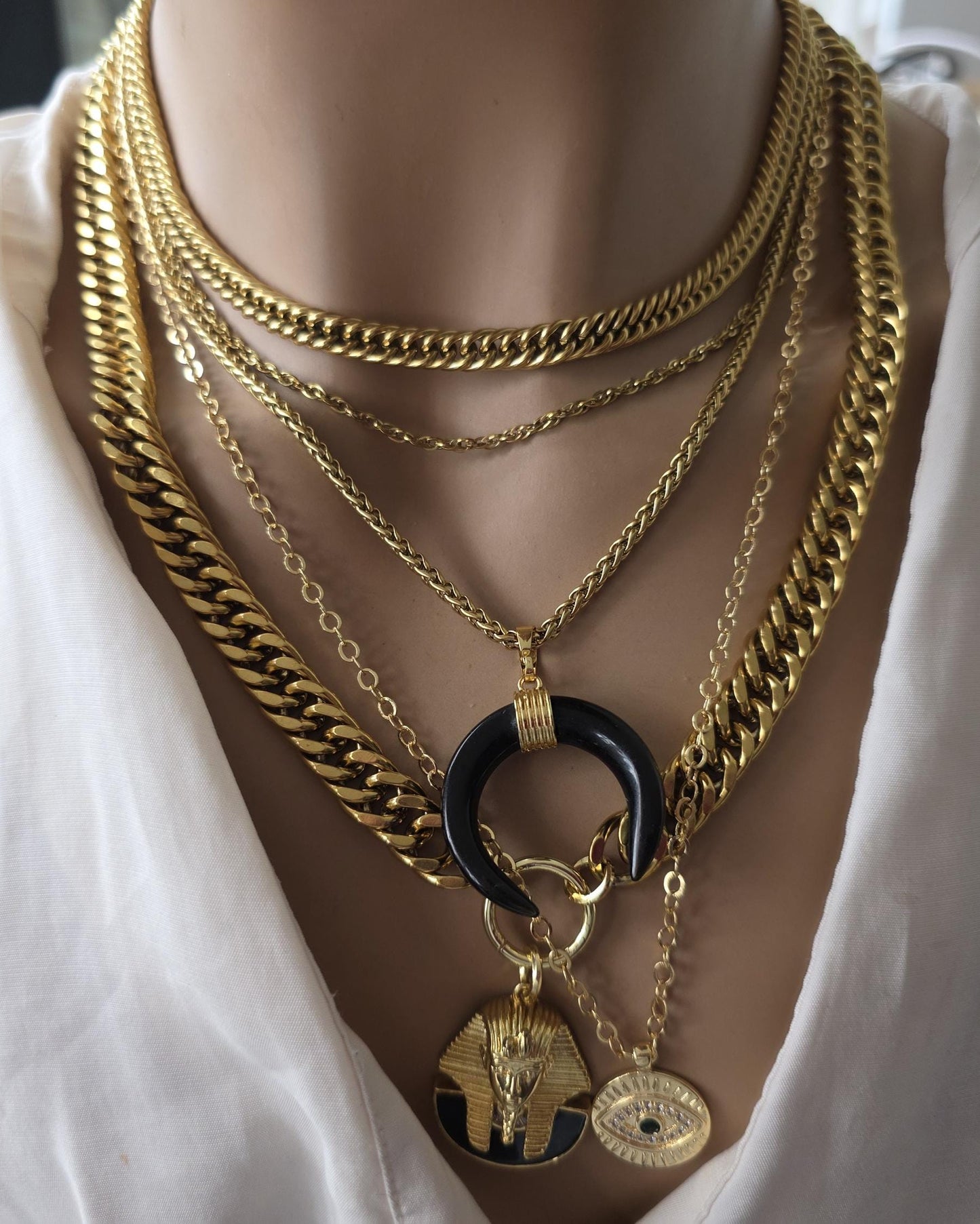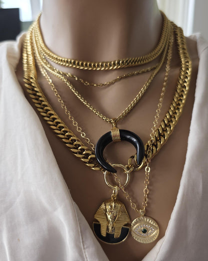 This is a handmade 24 K gold plated maximalist multi strand chunky chain layered stacked necklace set with Pharoah and agate horn moon pendant and evil eye charm.
