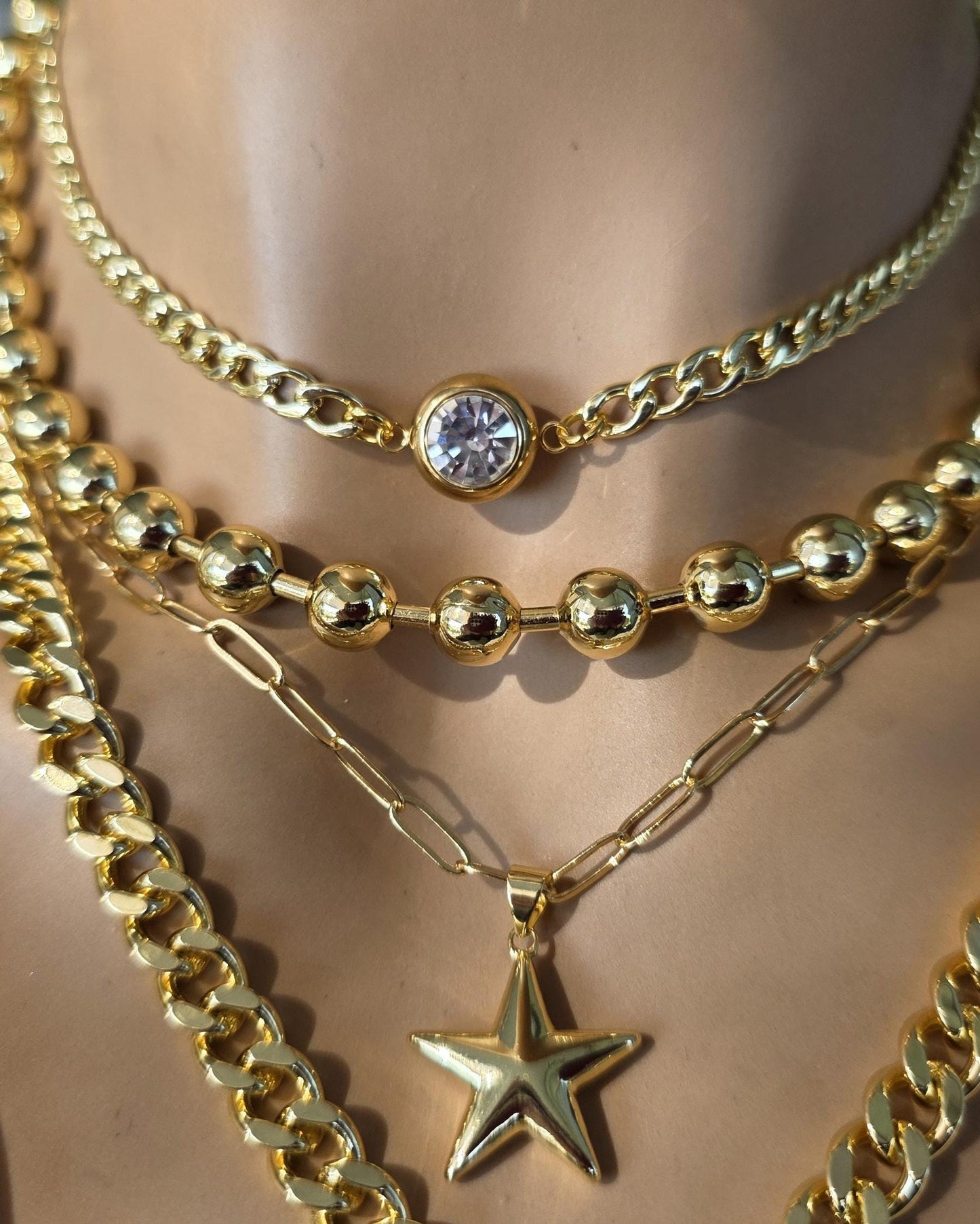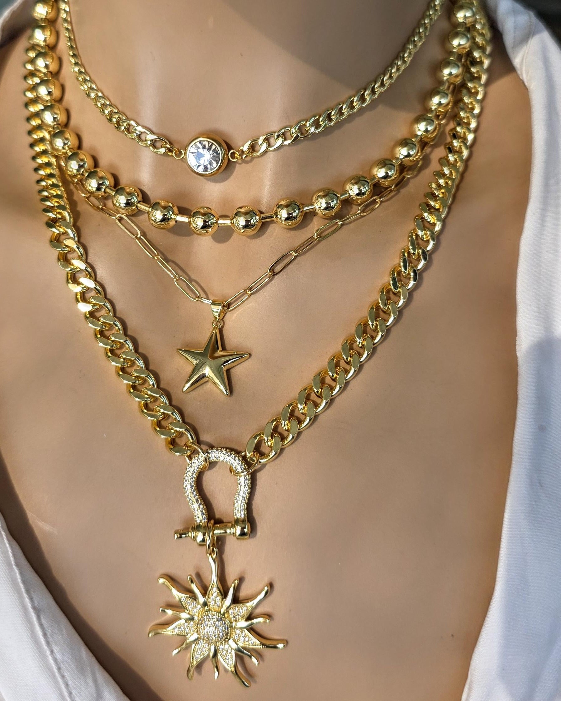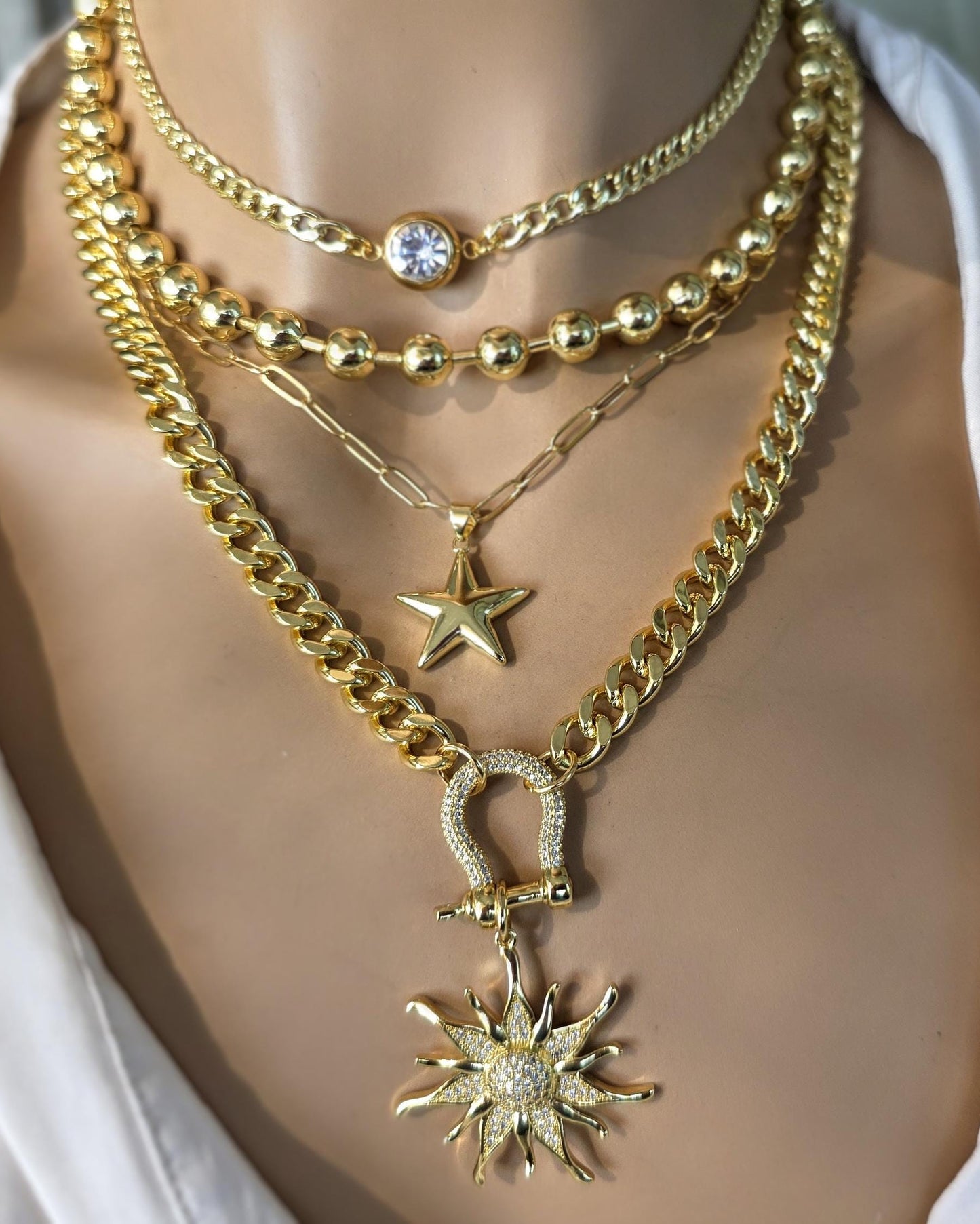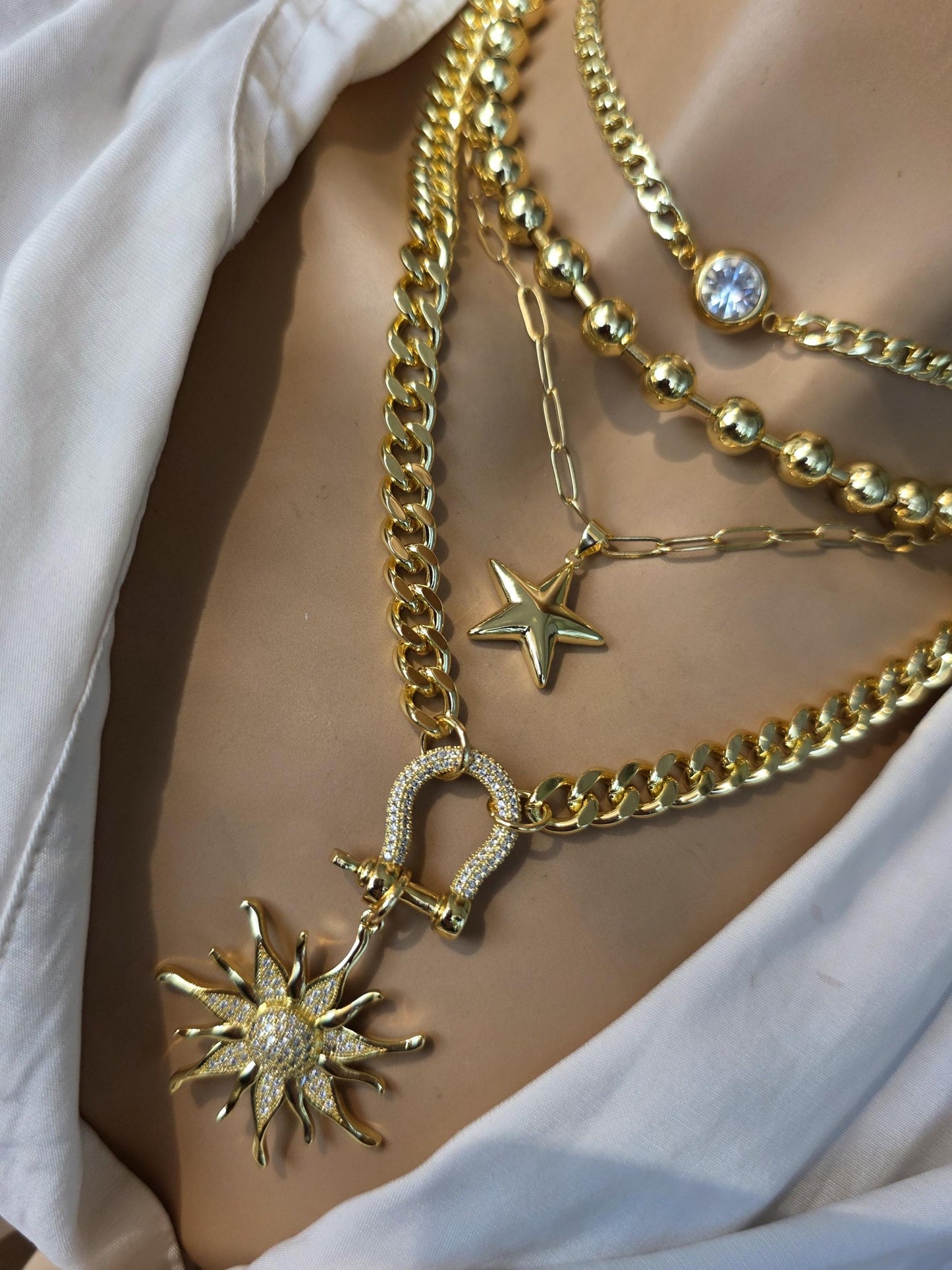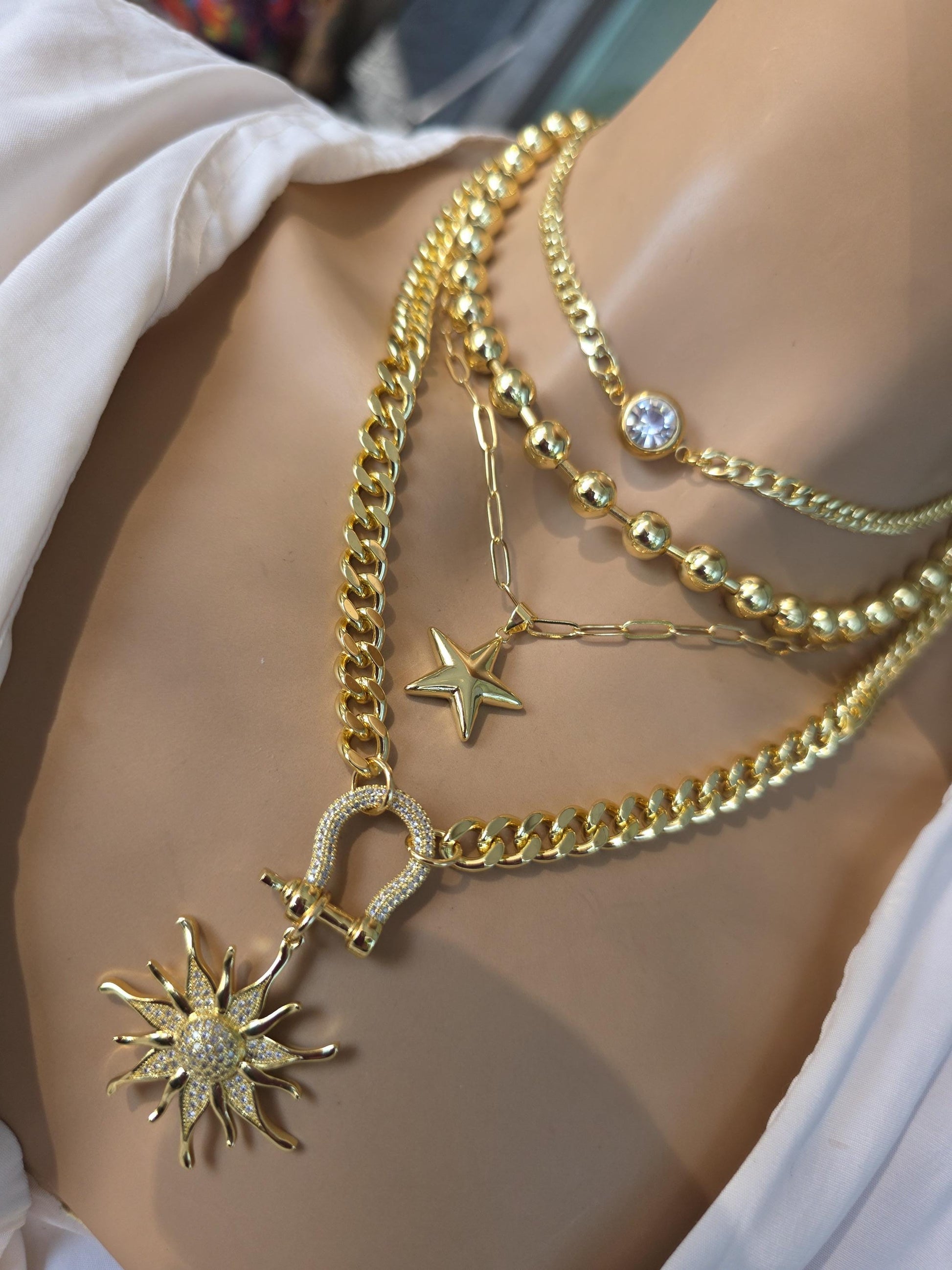 This is a handmade 24 K gold plated maximalist multi strand chunky chain layered stacked necklace set with sun and star pendants.