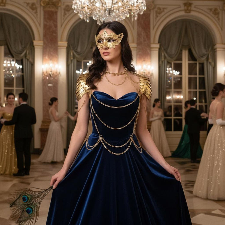 A striking fusion of strength and elegance, this gold scalemail shoulder armor features cascading chain festoons that frame the neckline and bodice with regal symmetry. Designed to command presence, it transforms any look into ceremonial adornment.