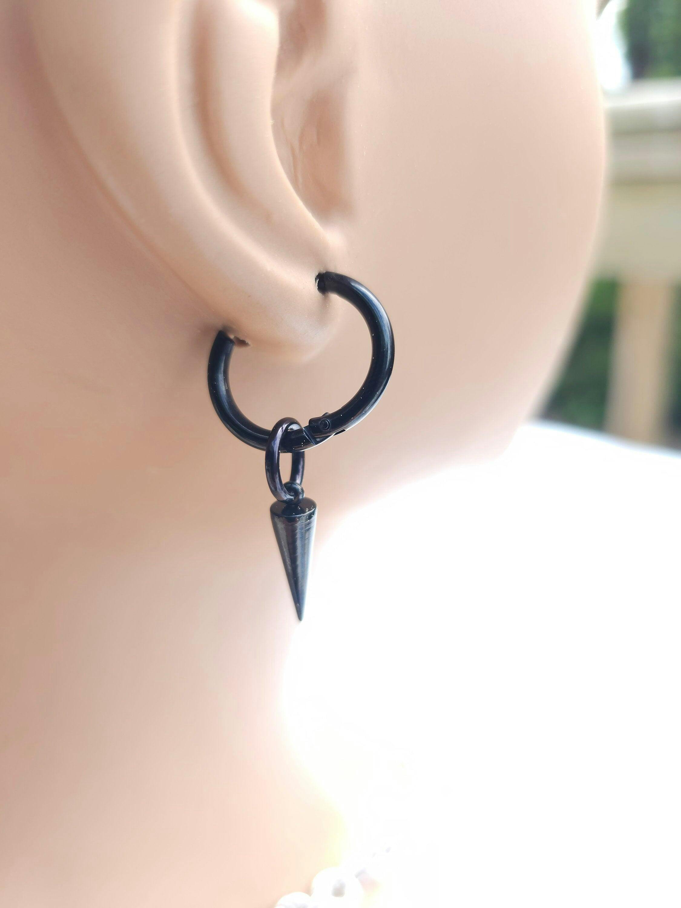 Gothic Steel Black Huggie Dangle Spike Earrings Hoops, Surgical Steel