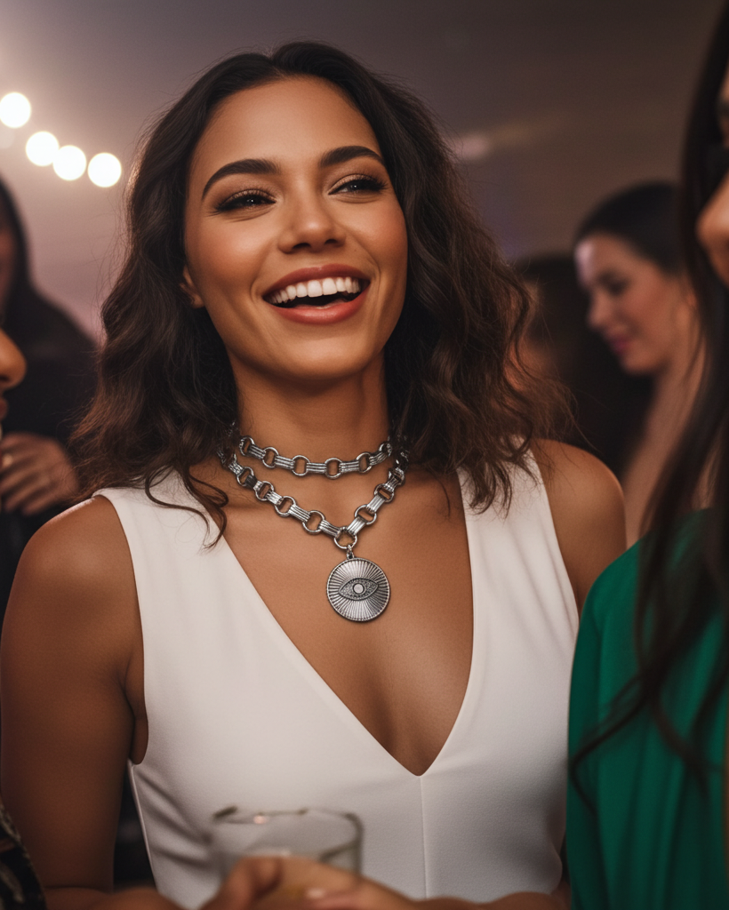 A symbol of strength and sight — this handcrafted stainless steel necklace is both statement and shield. Dual layers of bold chainmail links frame the throat and chest, grounding the piece with a warrior’s weight and a guardian’s grace.