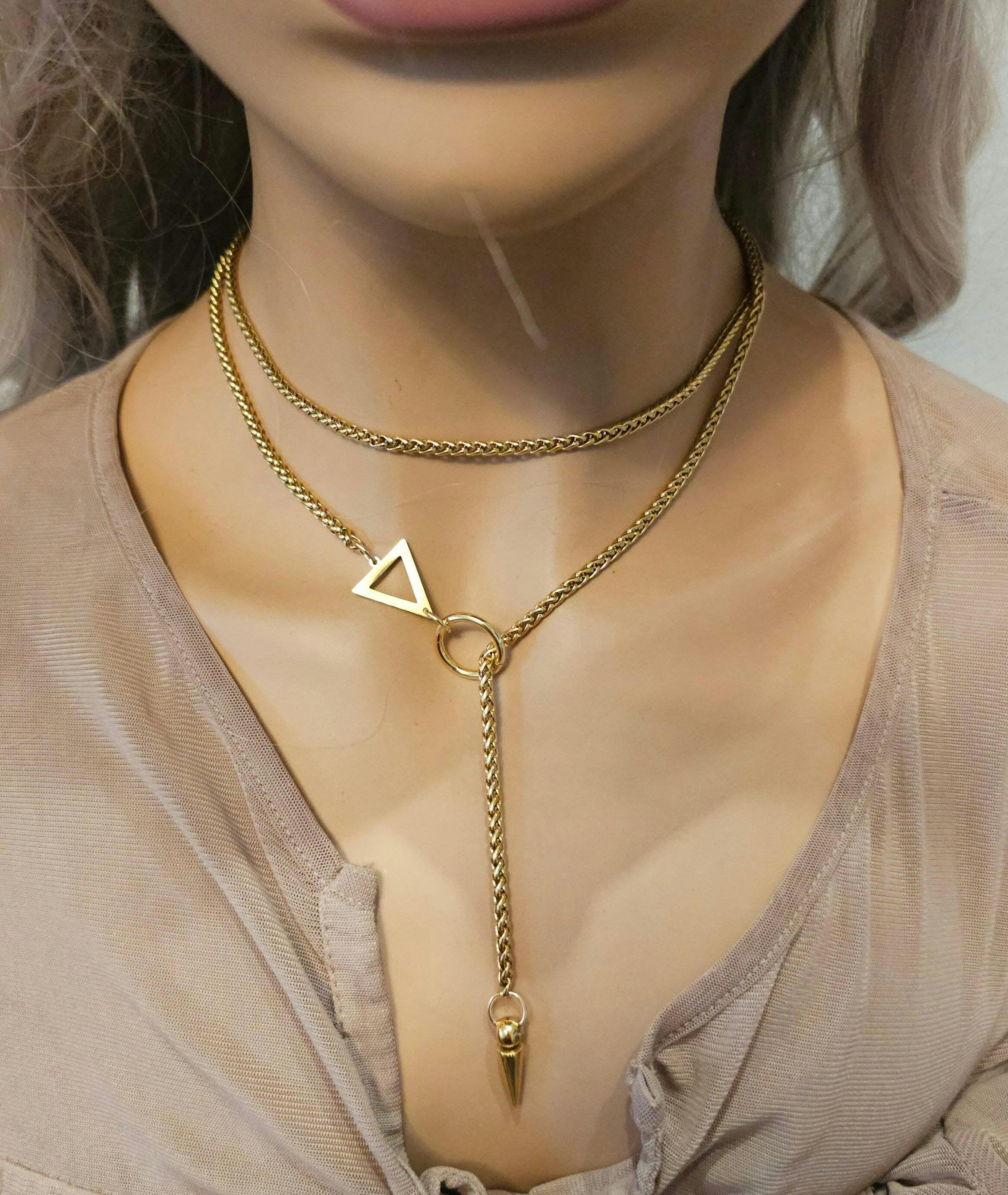 Command attention with this handcrafted stainless-steel chainmail necklace — a modern relic built for those who wear strength like armor. Each link is individually woven into a geometric lattice that forms a powerful triangular center, finished with a sleek steel spike that drops like a blade’s point.