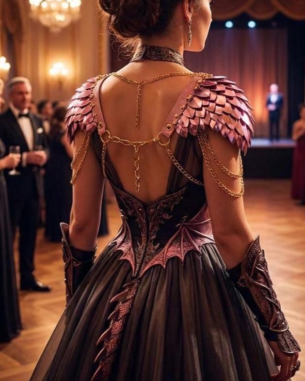 Romantic strength meets sculptural elegance. Rose-toned scales crown the shoulders while delicate chains drape the body in fluid, light-catching movement.
