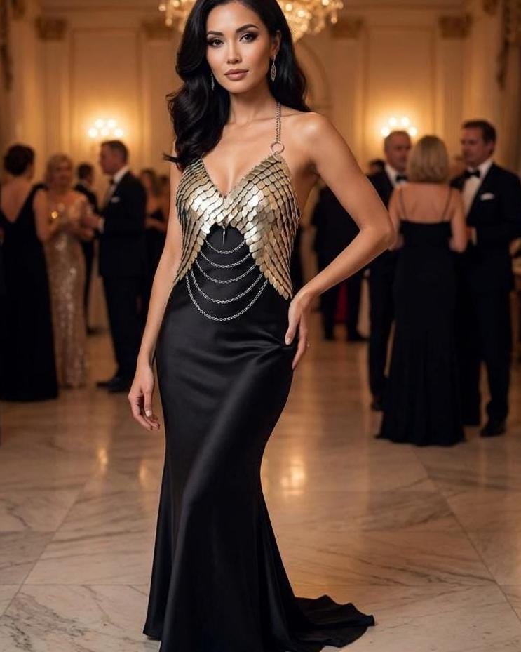 Unlike traditional scalemail, this design features hand-built contraction shaping within the chainmail structure, allowing the armor to contour to the natural curves of the body. The result is a sculpted, breastplate-like fit that enhances form while maintaining flexibility and comfort.