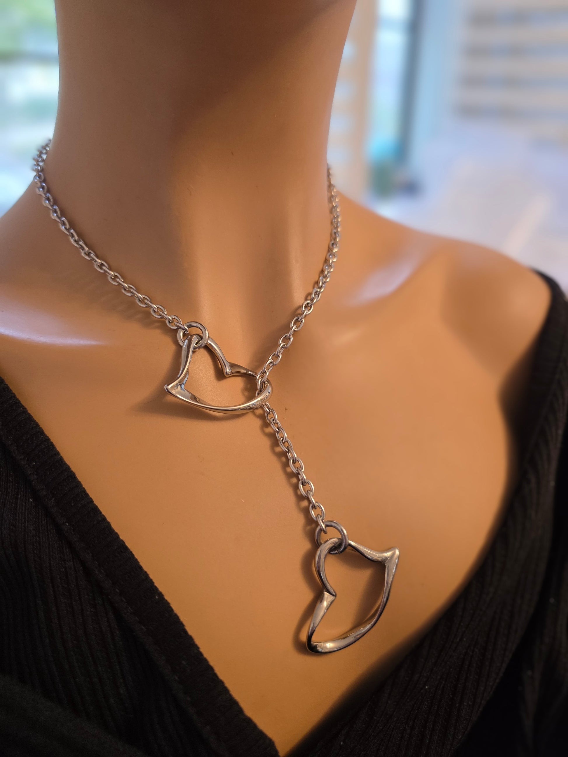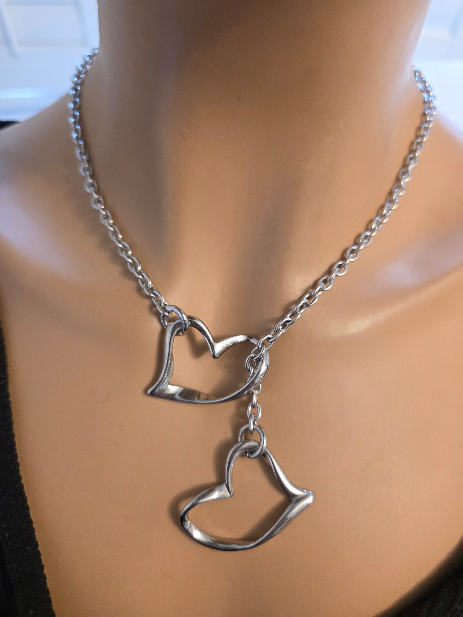 This slip Chain Necklace Leash Style Collar Choker Layered Set with Hearts is an elegant necklace that can be bought in two lengths. Once around and a heart through a heart, or have wrap twice for a layered stacking necklace look. This necklace has heart rings that pass through each other easily, and is 100% stainless steel. It comes in two sizes, small and large.