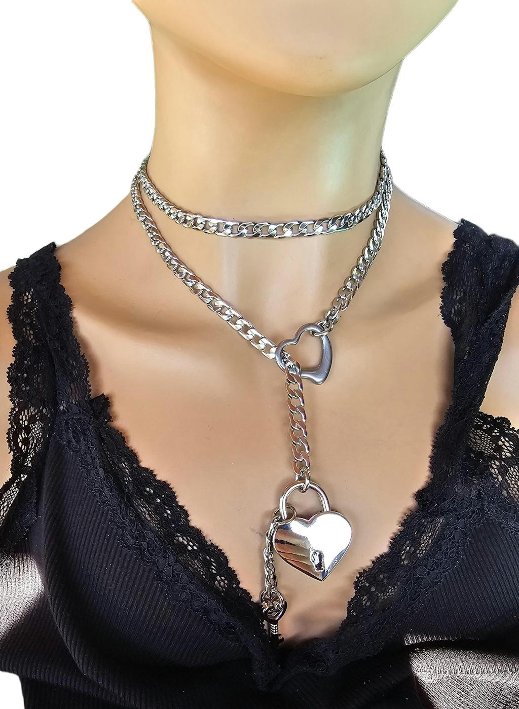 Long slip chain choker style layered wrap necklace, 100% stainless steel with stainless steel heart loop and a working steel heart shaped padlock and key. Key can be kept on the Padlock, on a keychain.